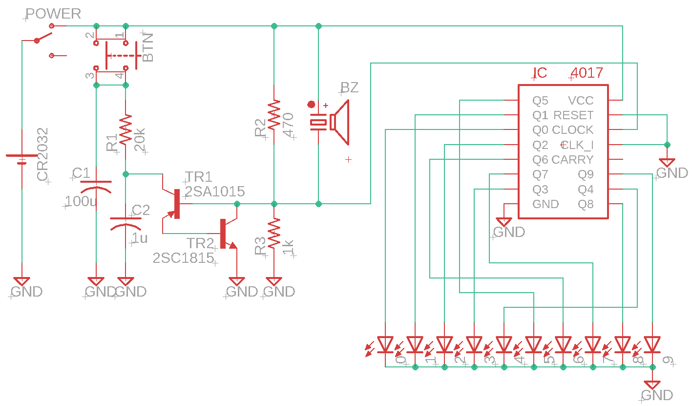 電子ルーレットを作ろう 投稿者:shiro 2022年7月15日2023年8月15日 ●回路図 ●はんだ付けテキスト(PDF)※2023/2/18修正 ●基板ガーバーデータ(ZIP、基板サイズ60×60mm)※8/15修正