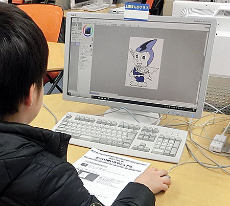 2018年2月25日(日) [子ども向け日記] H29年度後期:第10回活動日より今回から情報センターのセミナールームで、マンガのとびら絵(表紙)にパソコンで色をぬっていきます。