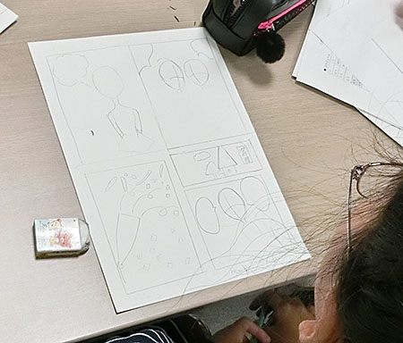前回に引き続き、ストーリーマンガ(テーマ「○○会」)のプロットとネーム作りをしていきました。